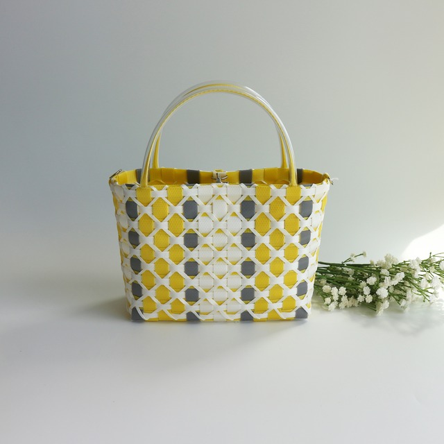 ちょっとお出かけや サブバッグとしても使える Sサイズのハンドバッグ 水濡れや汚れに強く、軽くて耐久性に優れた ポリプロピレンテープを使用し、 職人が一つひとつ丁寧に編み上げました。 相性の良い爽やかなイエロー×グレー。 マチがしっかりあるので収納力も抜群。 軽くて丈夫だから、遠出のお出かけにもぴったりです。 【素材】 ■ポリプロピレン ■合金製 ■PVC(軟質塩化ビニール樹脂) 【サイズ】 D底マチ 8.5 cm W底幅 20.5 cm H高さ(本体) 16.5 cm 持ち手長さ 35.0cm 【注意事項】 ■ 素材について ポリプロピレン素材は接着剤を使用していないため、 使うほどに柔らかく馴染んできます。 使用を繰り返すことで毛羽立つことがありますが、 その際は引っ張らずにハサミで優しくカットしてください。 ■ 水濡れについて 水に強い素材ですが、濡れた場合はタオルで優しく拭き取り、 完全に乾かしてからご使用ください。 ■ ショルダー利用について Lサイズ以外の商品には金具付きで、ショルダーとしてもご利用いただけます。 ※ショルダー紐はオプションです。 ■ ご使用上の注意 強く引っ張ると破損の原因となりますのでご注意ください。 ■ 色味・サイズについて 自然光で撮影しておりますが、光の加減やご覧の環境により、 色味が異なって見える場合があります。 また素材のロットや手作業による制作のため、 サイズに多少の誤差が生じることがございます。 ■ 保証について ご購入日より6ヶ月間は保証対象となります。 修理・交換、または代替商品のご提案をさせていただきます。 かごバッグ カゴバッグ プラカゴ 水濡れ 洗える 軽量 軽い お呼ばれ フォーマル パーティ プレゼント ギフト 浴衣 着物 母の日 イエロー ホワイト グレー